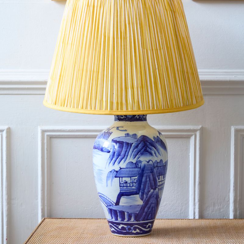 A large pair of Japanese late 19th/early 20th century blue and white porcelain vases converted into table lamps (pat tested). Each painted in underglaze blue with a river landscape and with the imari porcelain object mark on the base. The price are for the pair without the lampshades.