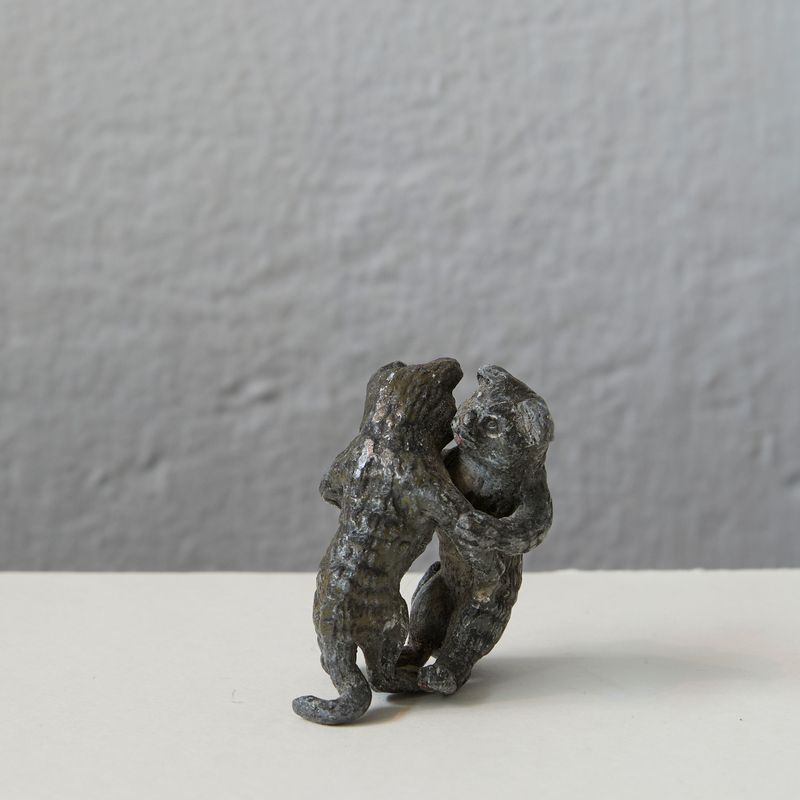 A set of three early 20th century Austrian cold painted cast bronze model groups, including two pugs, amusingly modelled at a table, one reading a newspaper, height 5cm, together with a cast metal model of a mouse holding a suitcase and umbrella, height 5cm, and a model of two wrestling cats.The price is for the set but they are available individually for £75.