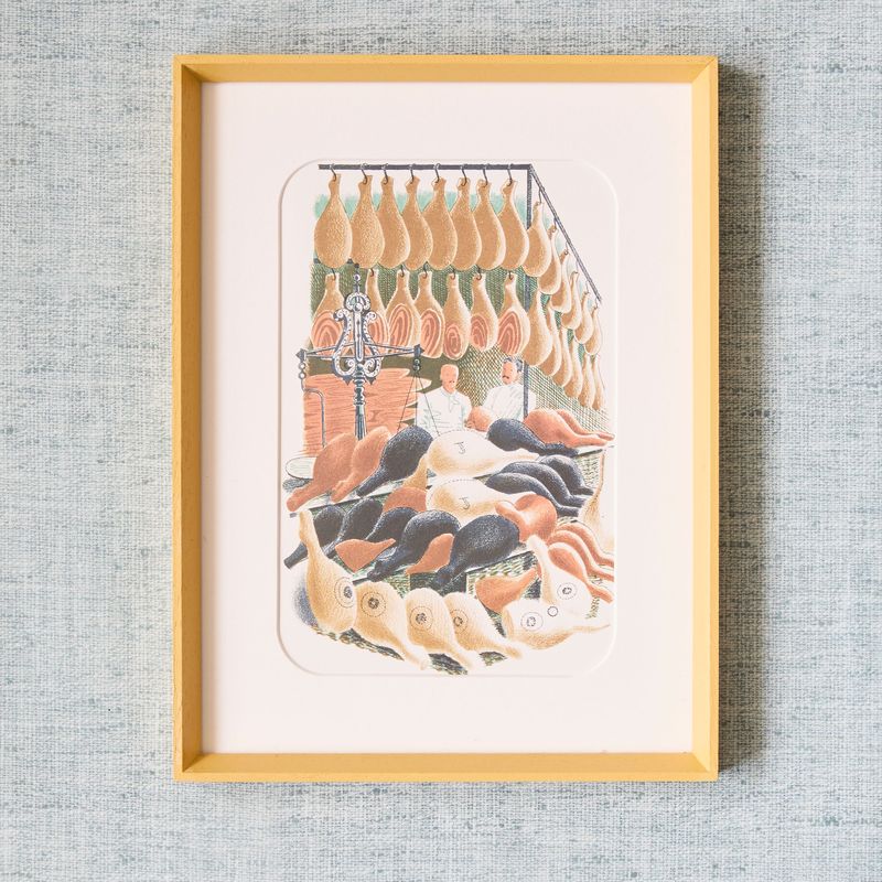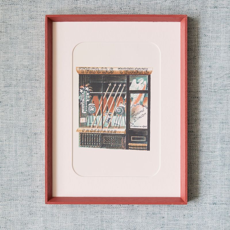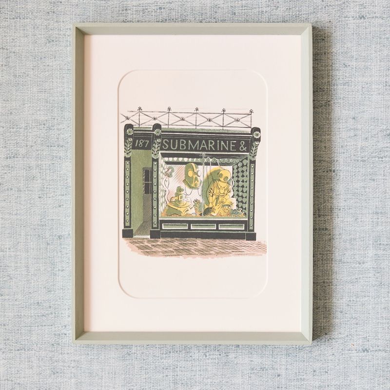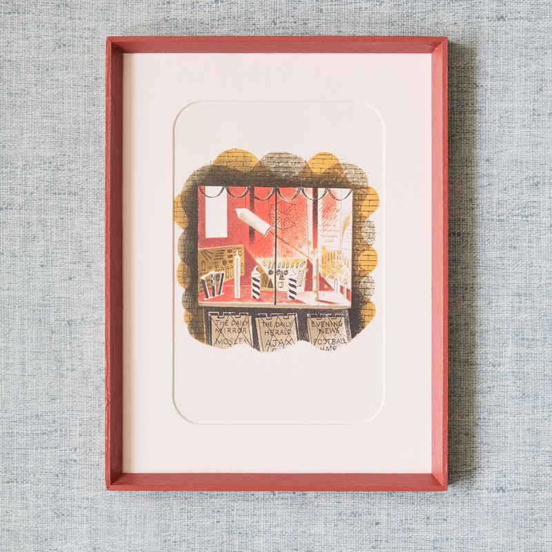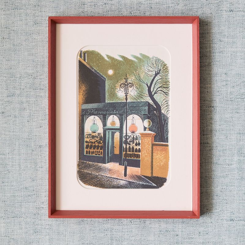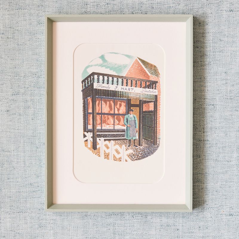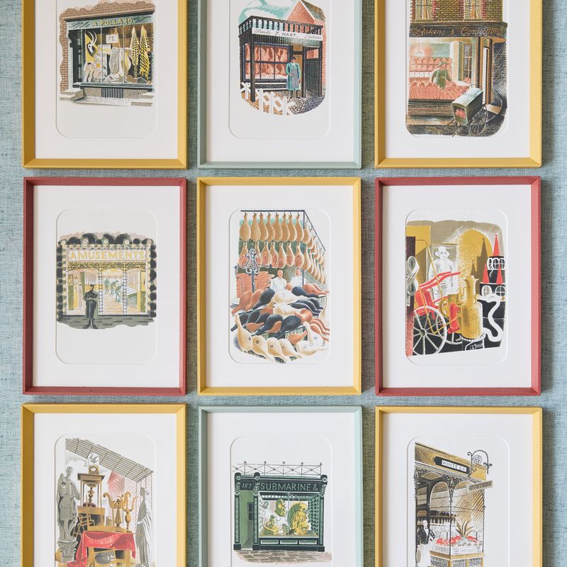A set of twenty four colour lithographs which were created by Eric Ravilious (1903-1942) for High Street, a book of shops written by J M Richards and published by The Curwen Press for Country Life Books in 1938. From a later edition of the book, they are mounted and framed in a hand-painted sloped frame with non-reflective glass. The price is for the set, but they are available individually for £120 each with a discount applicable for multiples.