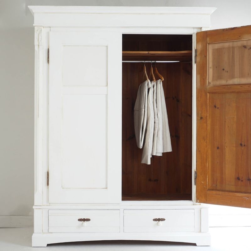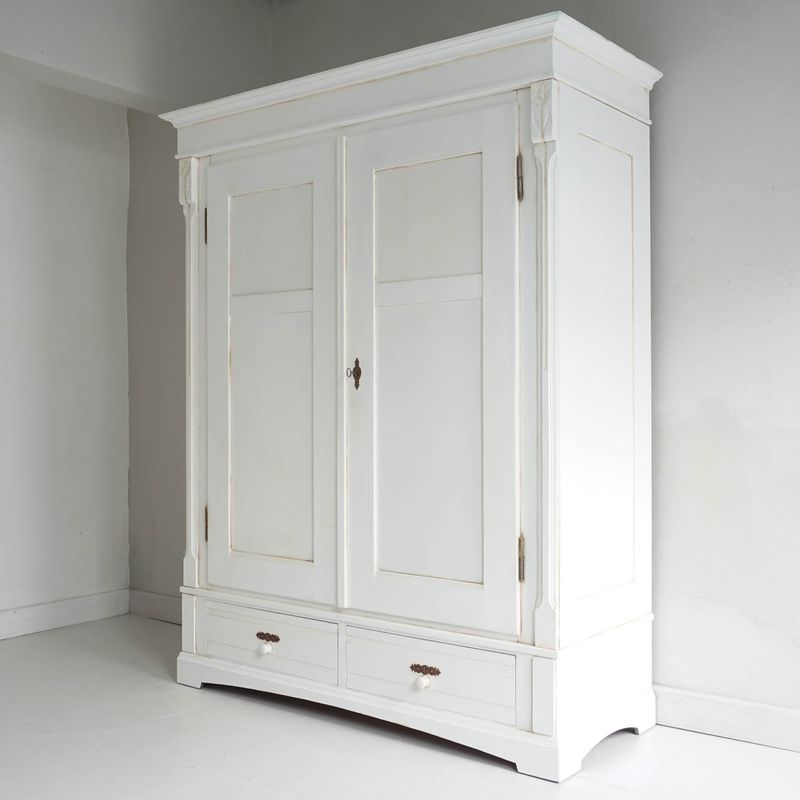 Antique Continental knockdown wardrobe recently refurbished in Rustoleum Chalk Paint (Chalk White) and lightly distressed. This piece fully dismantles for ease of transportation and access into awkward spaces. It is easy to assemble and then provides sturdy storage space. Fitted with a rail. Dimensions are to the largest external edges. Internal depth 57cm spacious for side to side hanging.