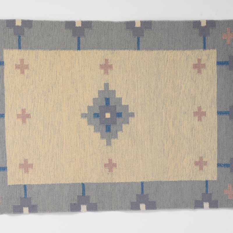 Mid-Century Swedish kilim with a blue boarder and cream field. Geometric pink cross decoration. Sweden circa 1960. All our carpets undergo a professional cleaning process. However, due to their age and previous life, some may exhibit minor signs of wear consistent with their history. Please examine the provided photos carefully or contact us for further information.