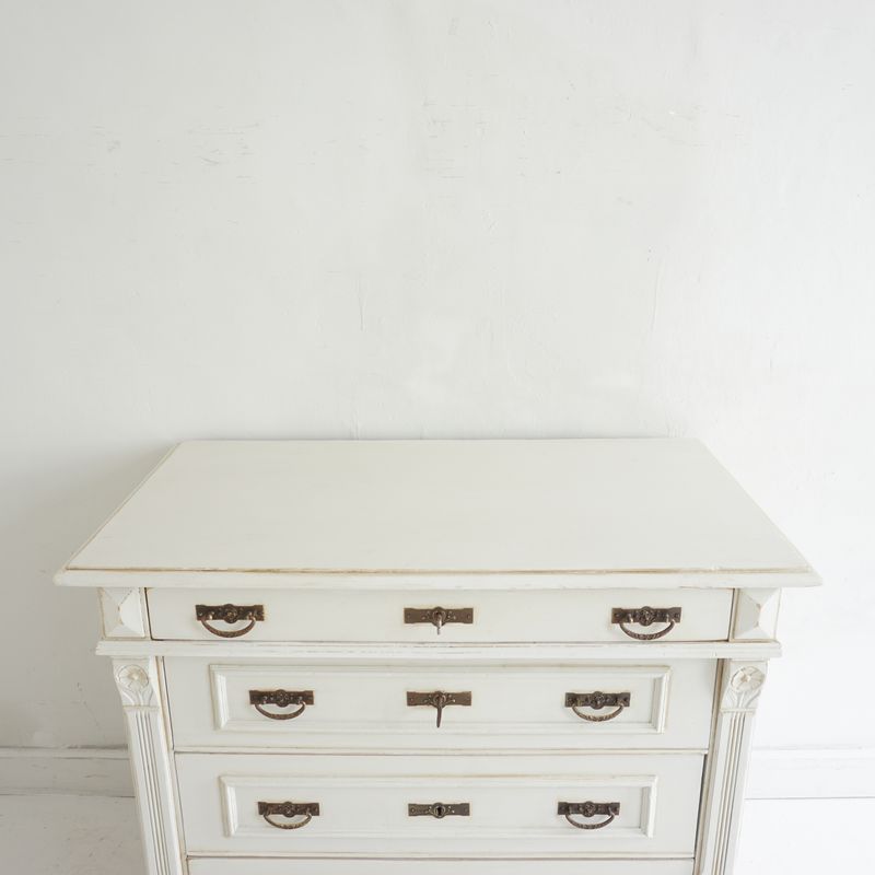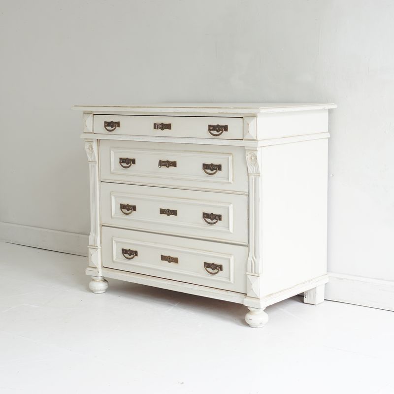 Continental chest of drawers recently refurbished in Rustoleum Chalk Paint 'Tanglewood' and lightly distressed. Attractive decorative carving, original handles and escutcheons.