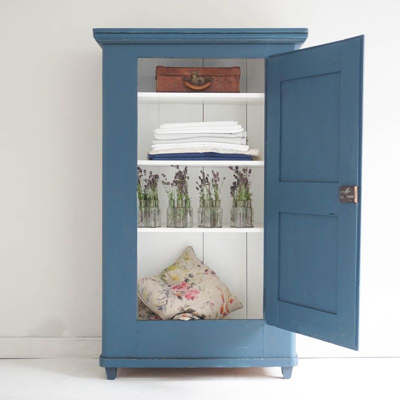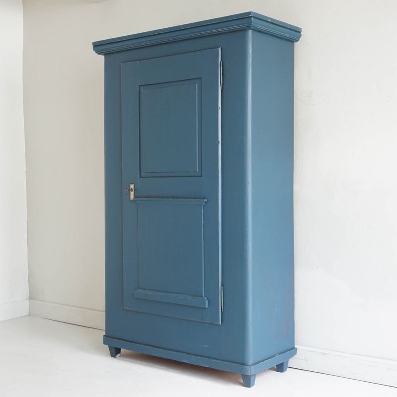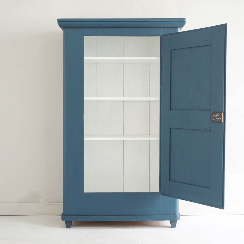 Continental cupboard recently refurbished and lightly distressed (Rustoleum chalk paint 'Evening Blue'). The pale grey painted interior has three shelves. Working lock and key. Dimensions are to greatest outer edges. Internal depth: 39cm.