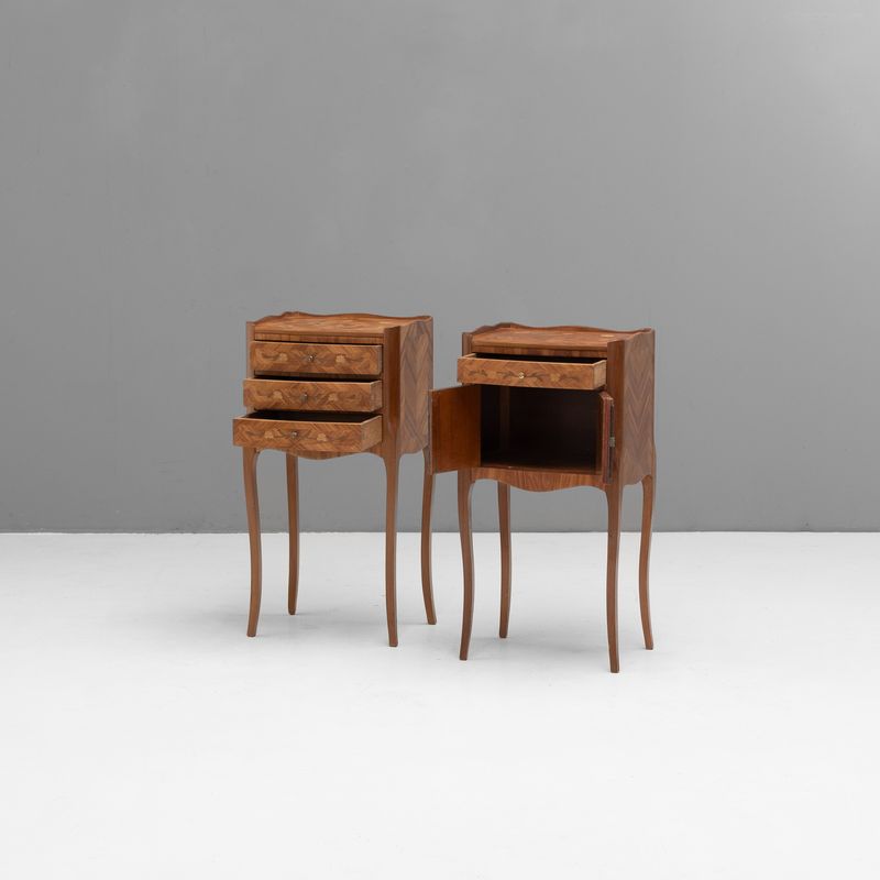 Pair of inlaid bedside tables on cabriole legs and faux book decoration. France circa 1930.
