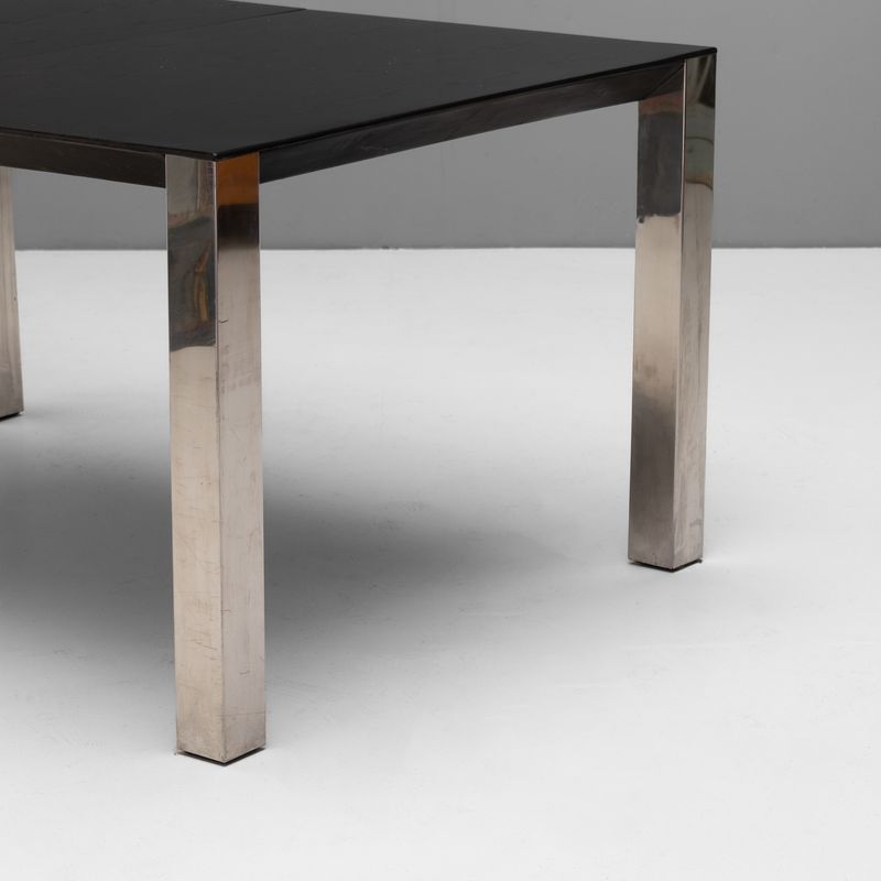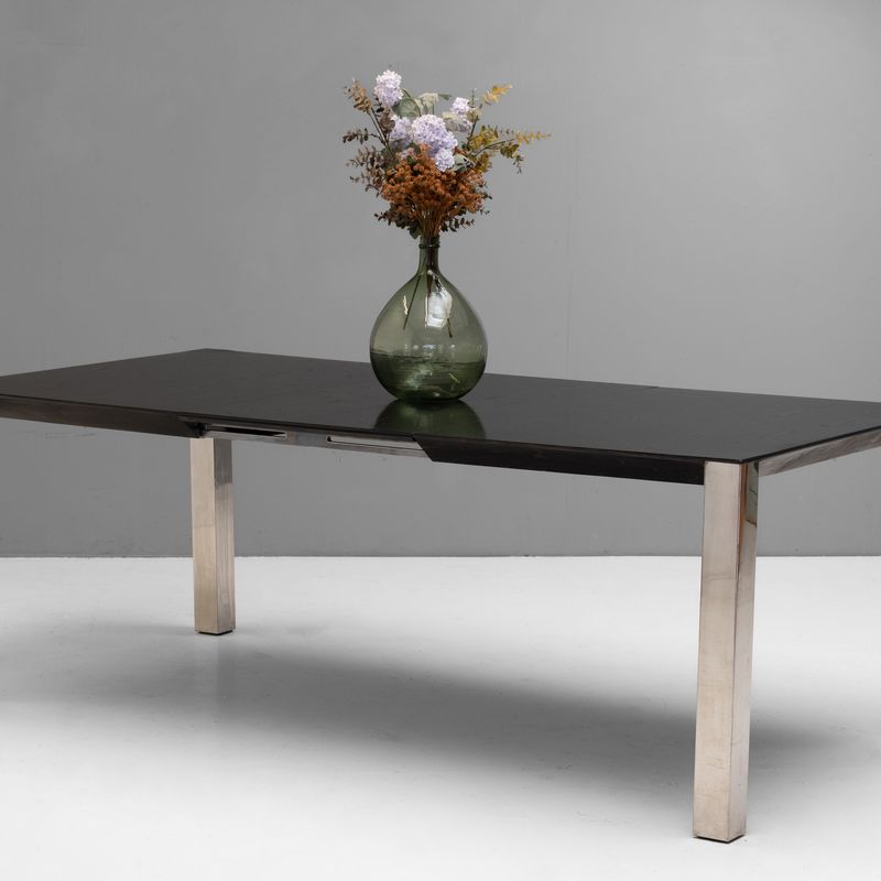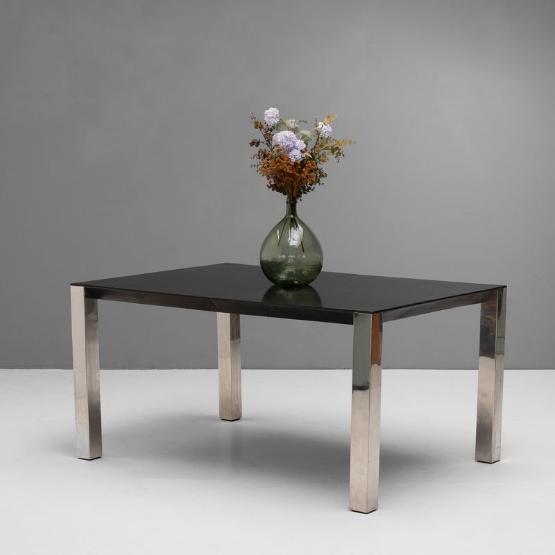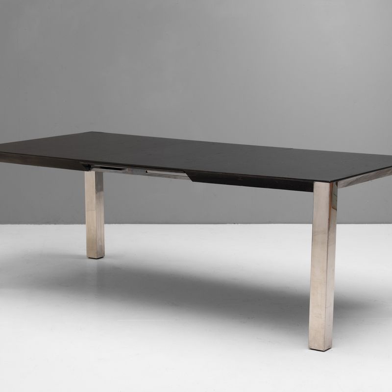 Large mid-century extending dining table with chromed legs and ebonised top. Italy circa 1960.