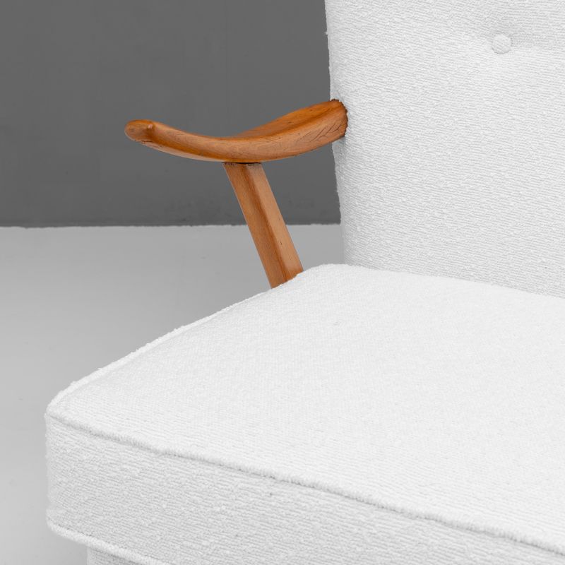 Mid-Century Bambino Sofa by Howard Keith, produced by HK Furniture. Solid beech frame, newly upholstered in boucle and re-finished show wood. Circa 1950.