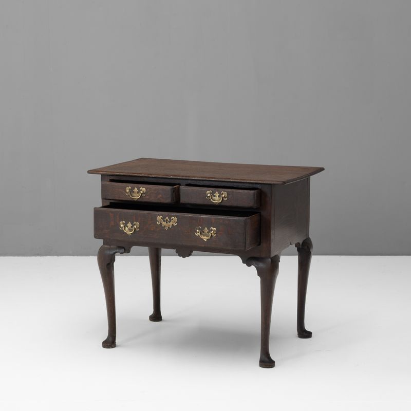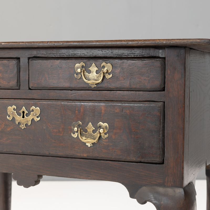 Oak lowboy with original handles and pad feet. Circa 1780.