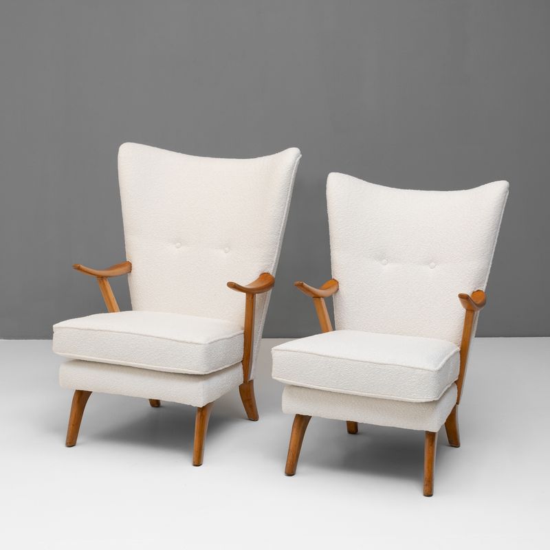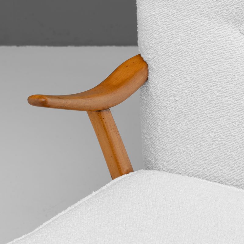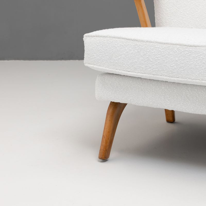 Pair of His and Hers Bambino armchairs by Howard Keith produced by HK Furniture. Solid beech frames and newly covered in boucle. Circa 1950.