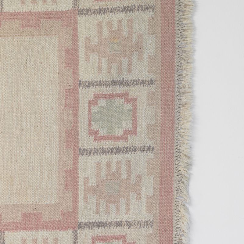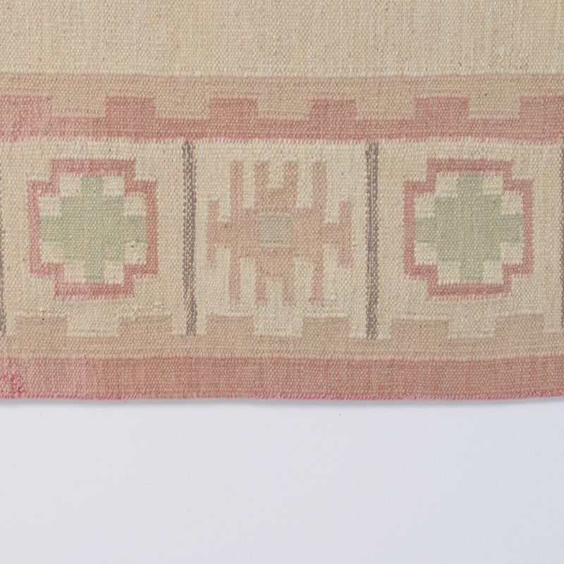 Pale cream and pink mid-century Swedish kilim with a tiled pattern boarder and plane central field. Sweden circa 1960. All our carpets undergo a professional cleaning process. However, due to their age and previous life, some may exhibit minor signs of wear consistent with their history. Please examine the provided photos carefully or contact us for further information.