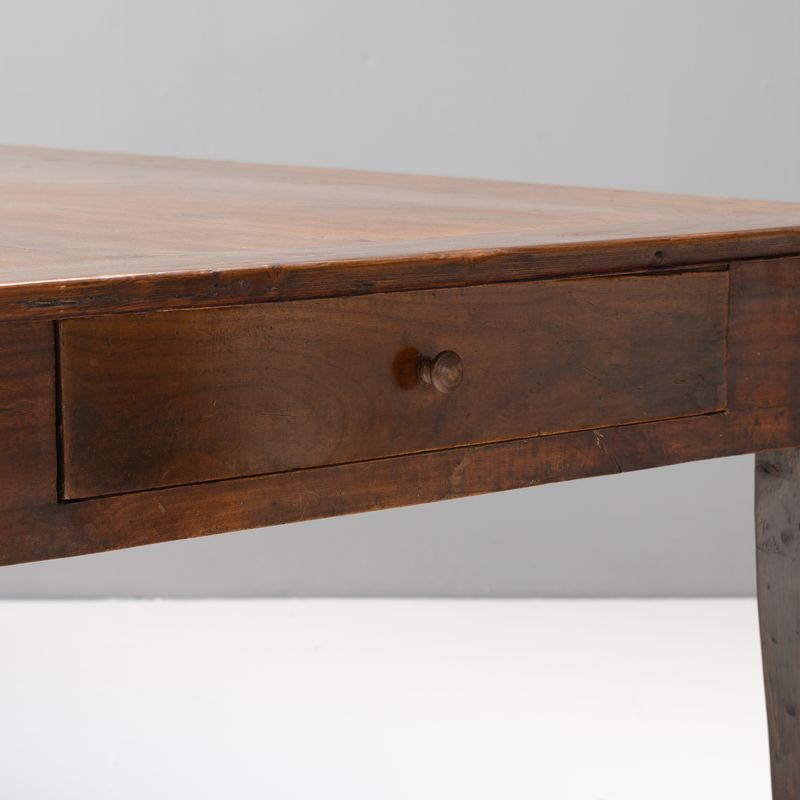 French farm table with polished pine top on cherry base and single drawer at one end. Circa 1880.