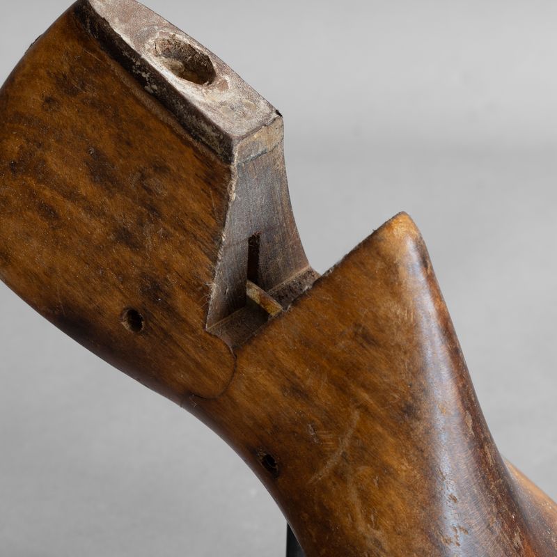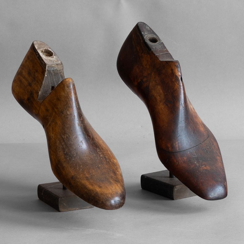 Shoe lasts on custom steel stands. Polished. Sold individually. 70 Available. U.K circa 1900.