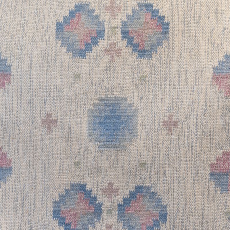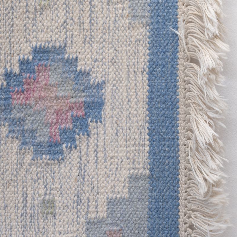 Small sized Swedish kilim with a cream base and blue border, hints of pink. Sweden circa 1960. All our carpets undergo a professional cleaning process. However, due to their age and previous life, some may exhibit minor signs of wear consistent with their history. Please examine the provided photos carefully or contact us for further information.