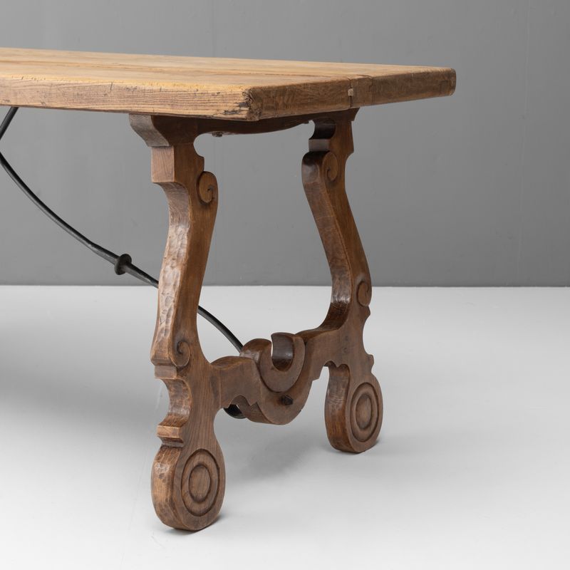 Spanish style walnut dining / console table with original metalwork. Circa 1930