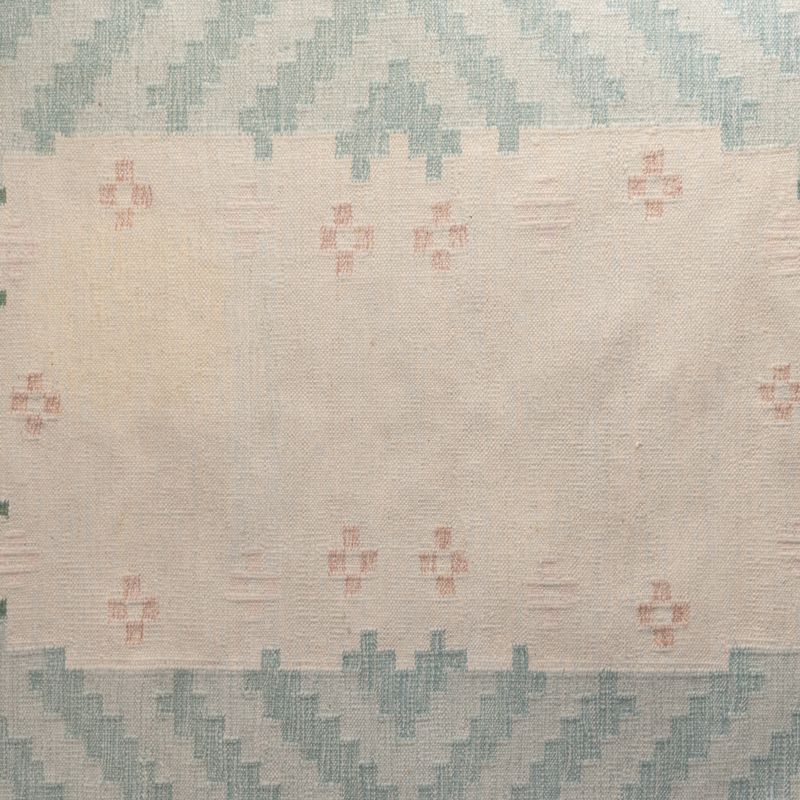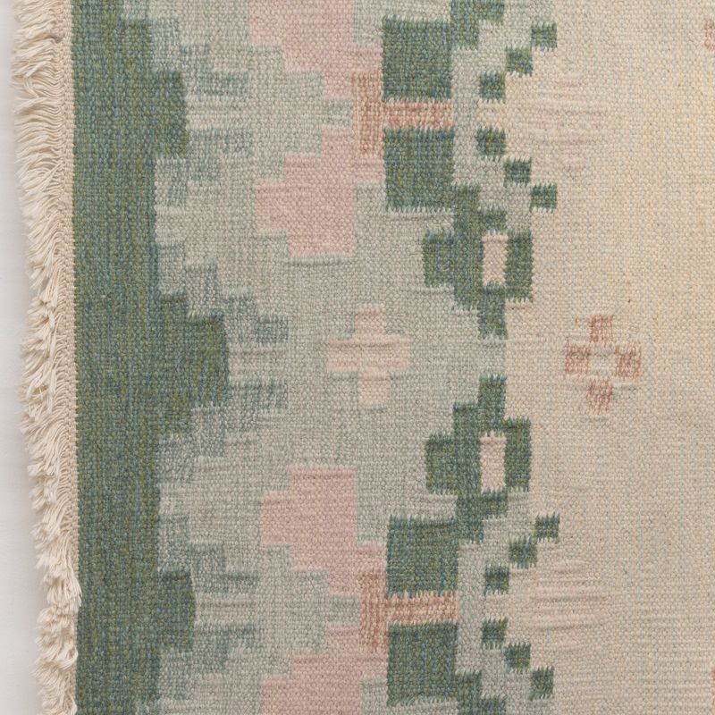 Mid-Century Swedish kilim in tones of creams and green. Signed IJ. Circa 1960. All our carpets undergo a professional cleaning process. However, due to their age and previous life, some may exhibit minor signs of wear consistent with their history. Please examine the provided photos carefully or contact us for further information.