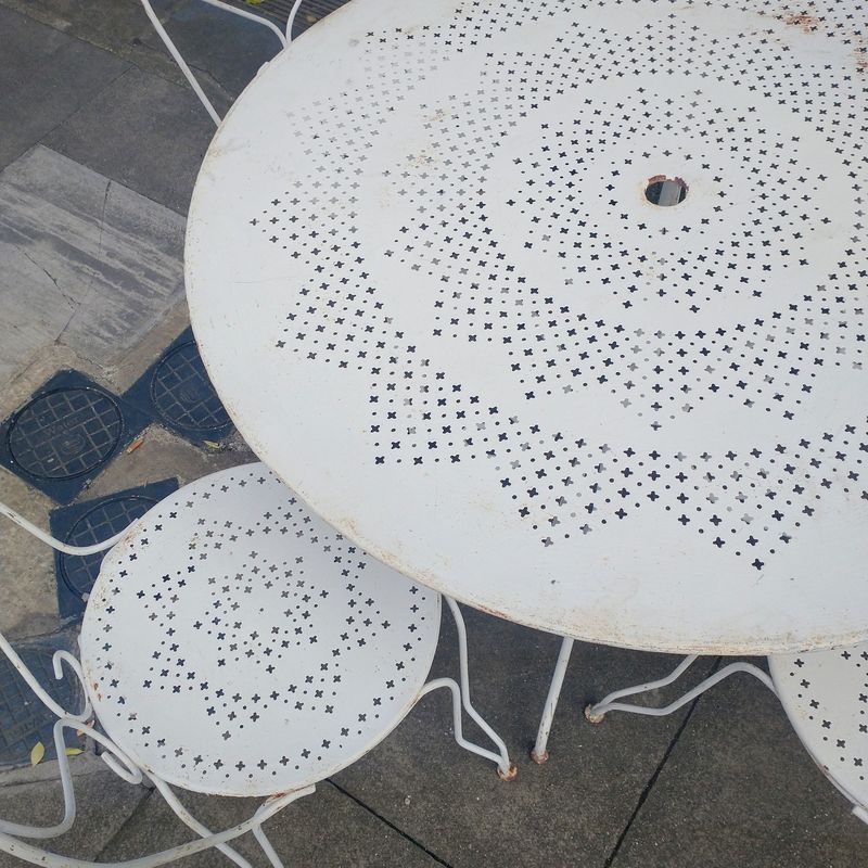 A really nice quality French 40s wrought iron round table and 4 chairs. Painted white and in excellent condition with good weight to it. Garden worn but no dings or corrosion. Both the table and the chairs are well proportioned and larger than you normally find with a pretty pierced decoration.