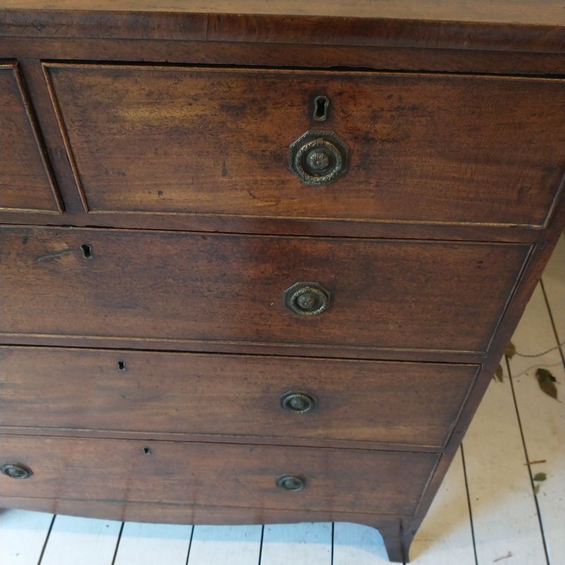 English 1830. Figured mahogany. This chest has a very pleasing shape and colour. The drawers all work well and have all their mouldings and original brass ware. Nice tall feet compliment an elegant sweep and narrow proportions....in fact it is quite handsome. As ever it has one or two faults, but minor things - perhaps worth a once over even if it is priced to sell fast