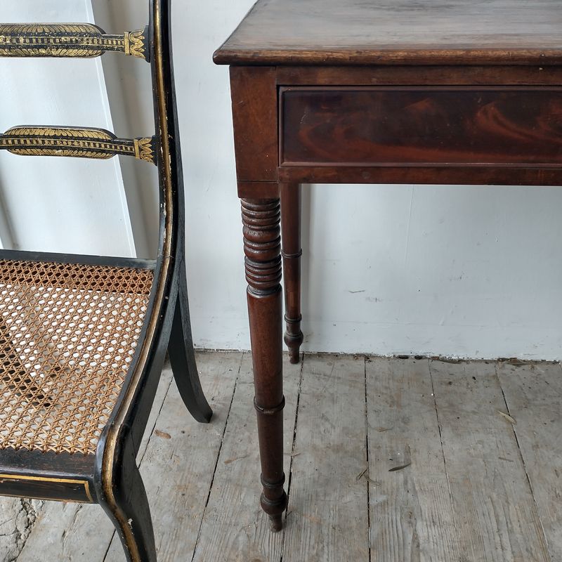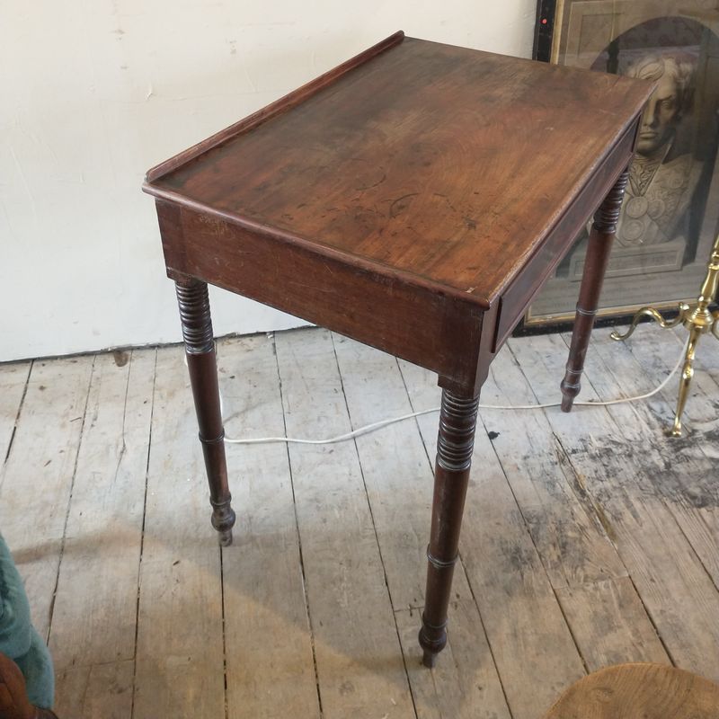 George III mahogany 210 year old writing table. Unusually tall striking ring turned legs. Large draw. English 1810. Fantastic to get even the tallest knees under. Country house condition which is to say solid sound condition, no damage but a rather patchy bruised well used finish. It would love a repolish but is keenly priced