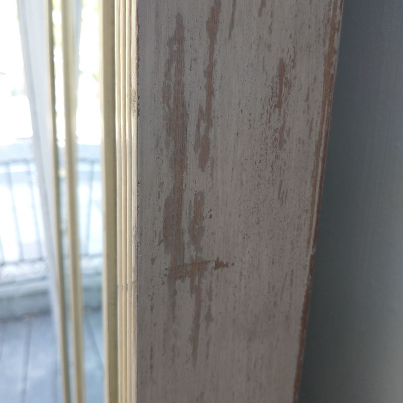 Not one you see every day is this French mid century Venetian type mirror. The flat centre plate with angled borders engraved and frosted acid etched with stylised leaf motive. Original back lit, now with low voltage LED so it illuminated the etched decoration. Old ivory painted wooden frame and back. An unusual thing of beauty.