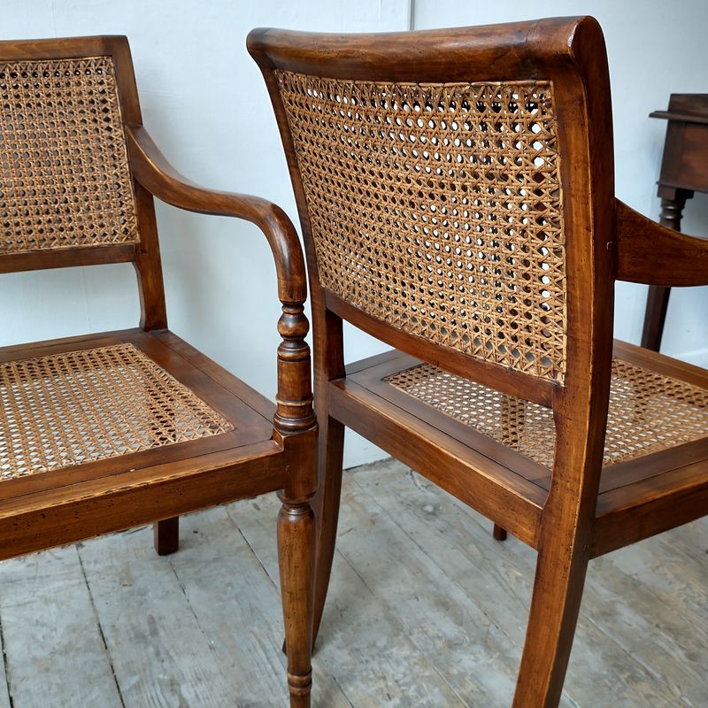 Contemporary but well made and elegant pair of carver armchairs Inthe Colonial antique style. Pegged construction with double caned back. Excellent condition. Not antique but used.