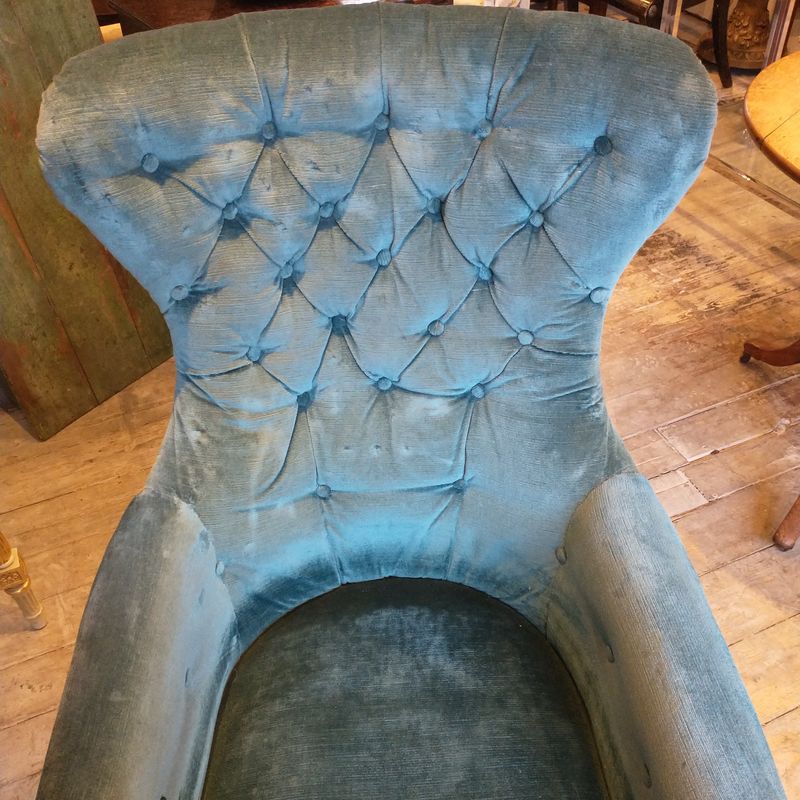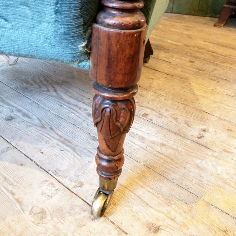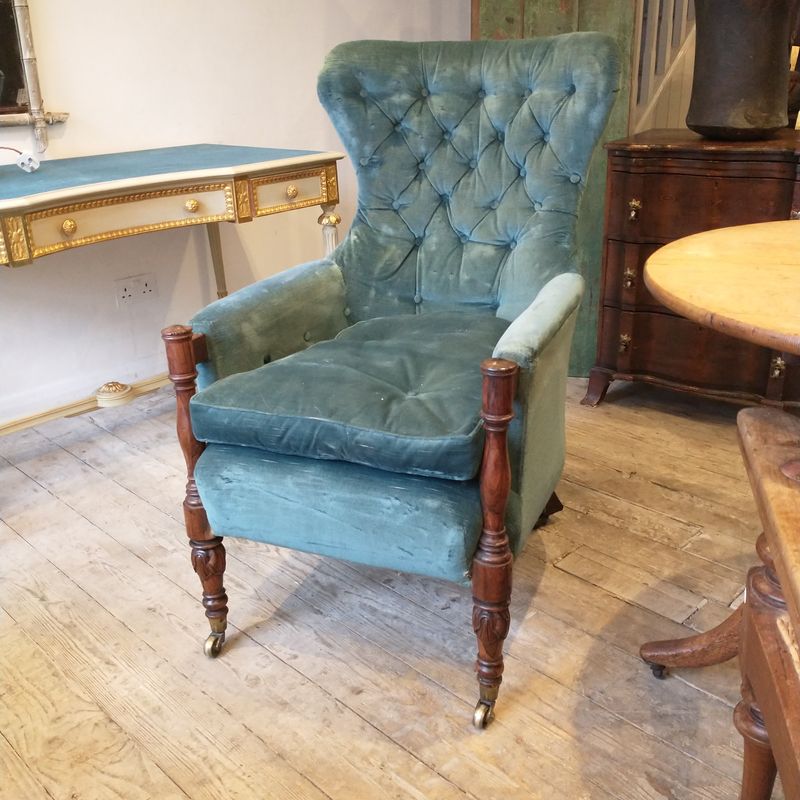 This unusual library armchair has a rosewood frame and blue worn velvet upholstery. It is English c.1835 and is unusually elongate with a thin curved slightly winged back. Superb quality. Original castors and in excellent condition. The upholstery is clean and usable but worn.
