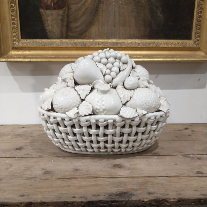 White glazed pottery basket of fruit. c1960s Spanish. (Casa Fina). Large size 44cms wide. No damage to lattice, one or two very minor nibbles. If this is your cup of tea Casa Pupo etc this is an unusual collectible example.