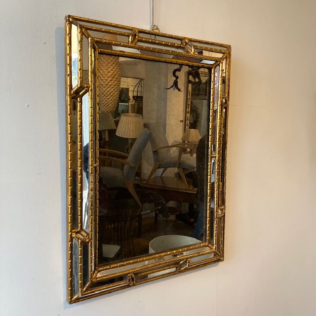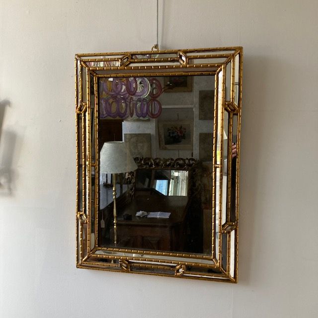 A 1950s gilt cushion mirror, original foxed mirror plate, historical crack on one mirrored upright. France.