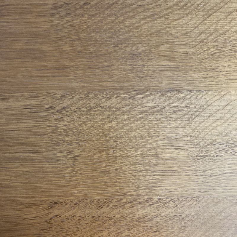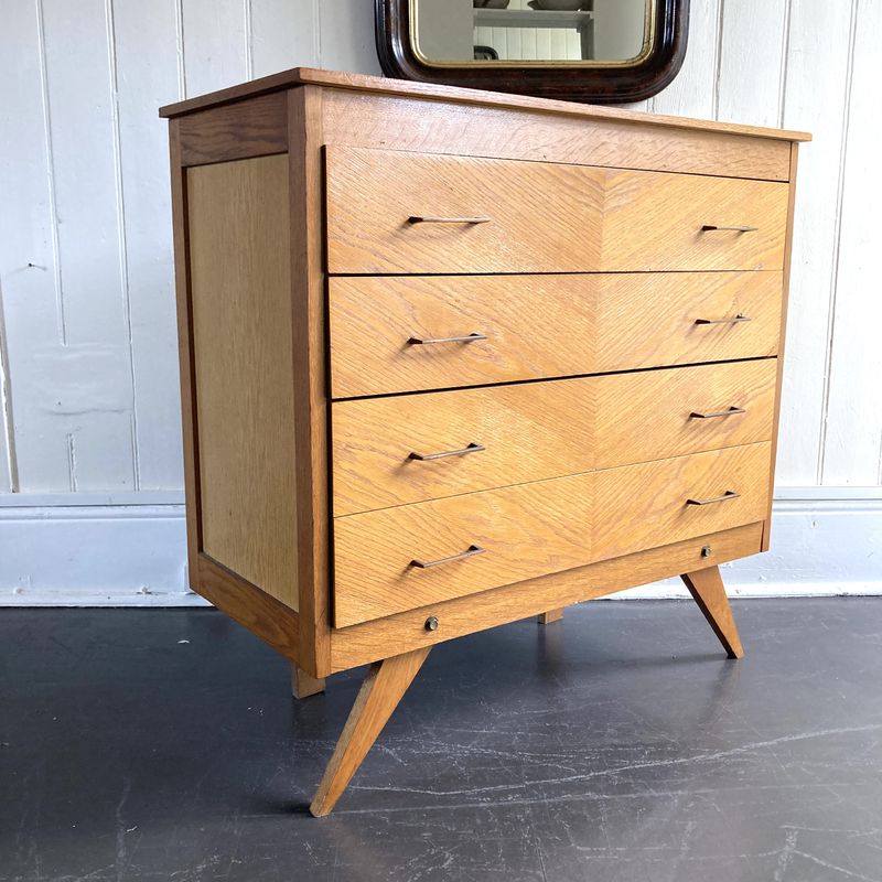 A 1960s French chest of drawers with matched oak veneer, brass handles and long bolt securing the legs front to back.