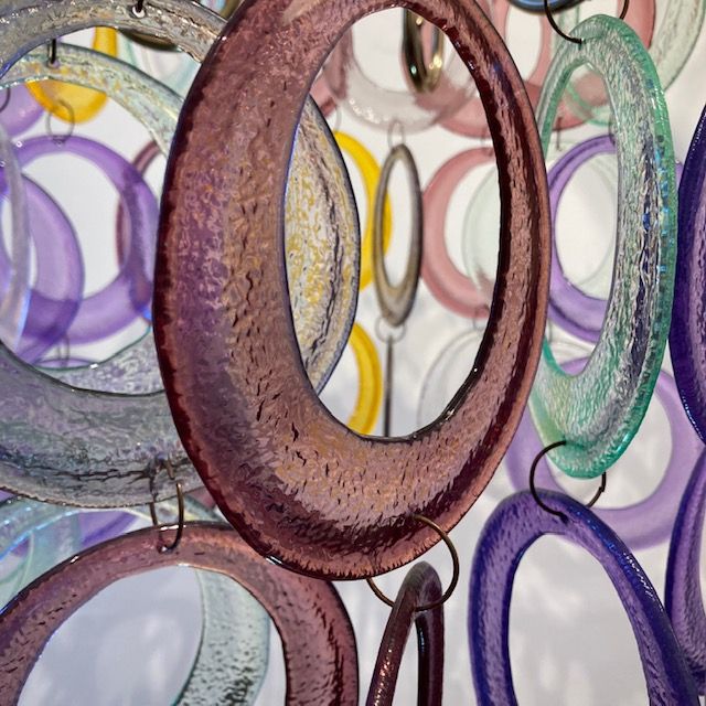 Colourful 1970s perspex chandelier with individual hanging coloured hoops. Belgium.