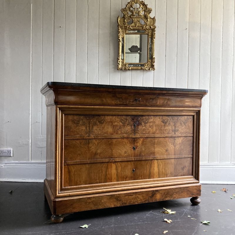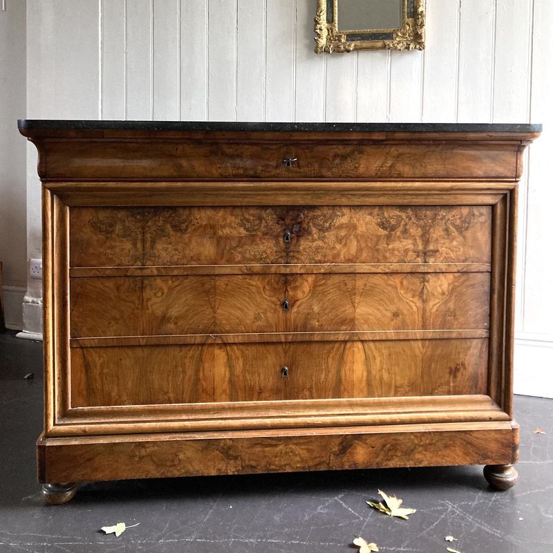 A super quality 19th century Louis Phillip burr walnut commode bookmatched veneer front, wonderful colour with black Belgium marble top. Five drawers, one consealed in the plinth, brass escutcheons and working locks