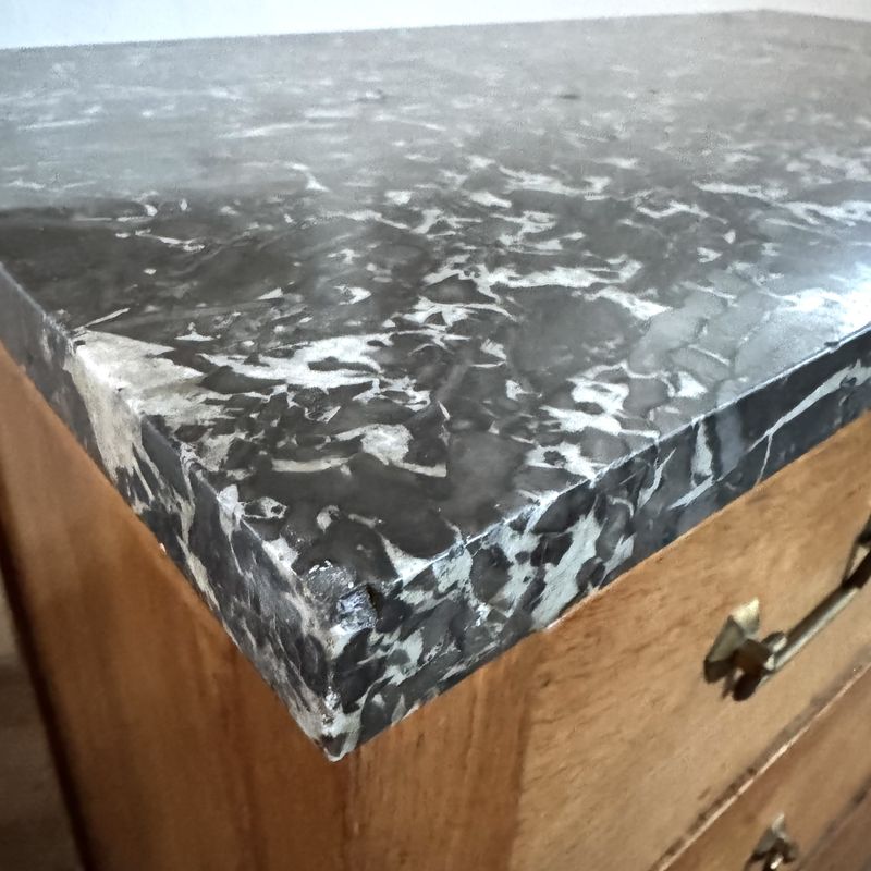 19th century French three drawer oak commode brass handles escutcheons and square caps on feet with a marble top.