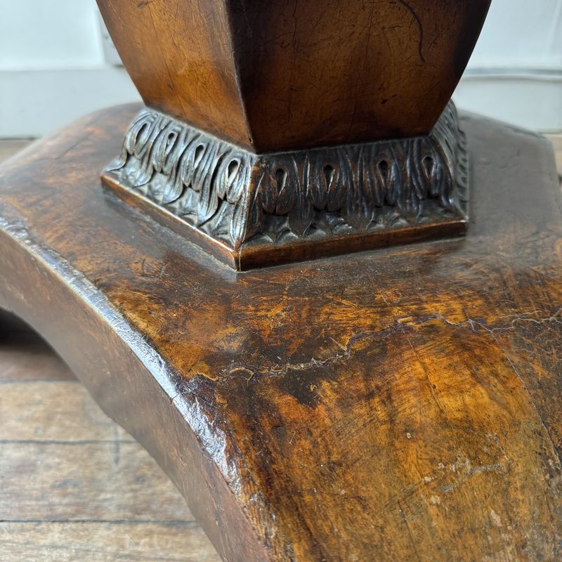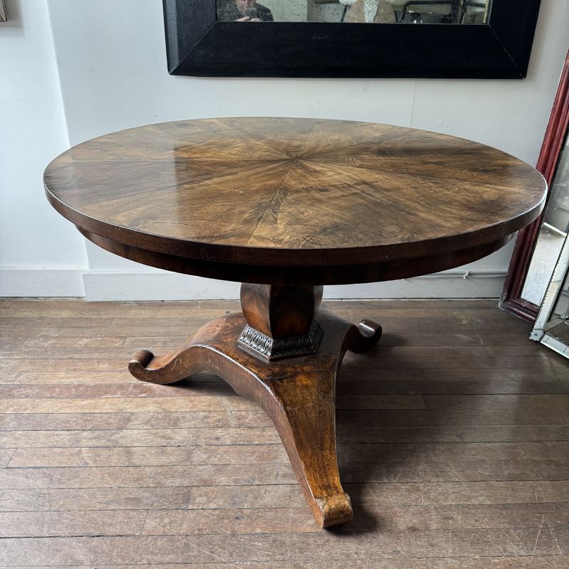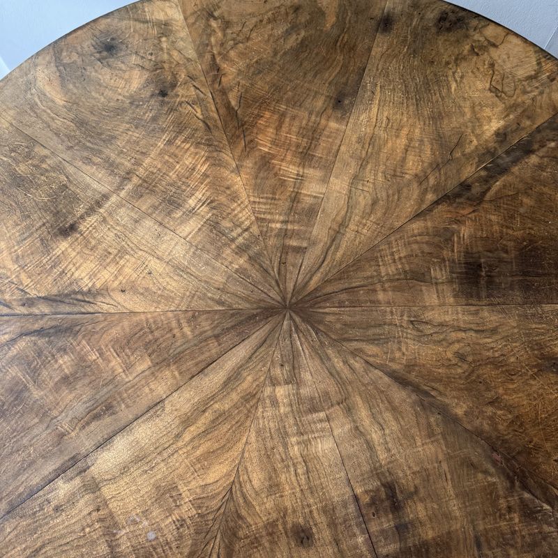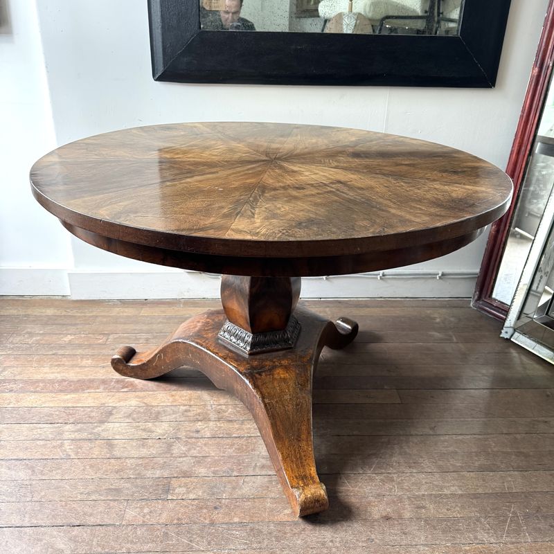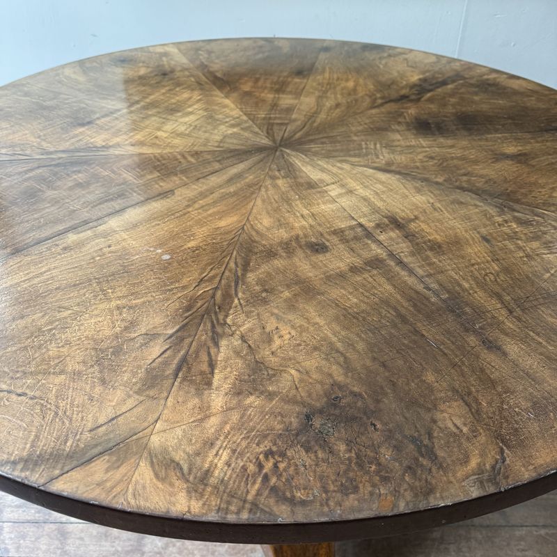 19th Century French circular walnut centre table on a pedestal tripod base. A star veneer on the top. Rich colour overall with a few historic repairs. France