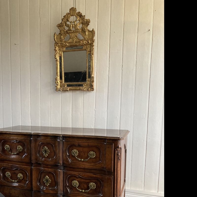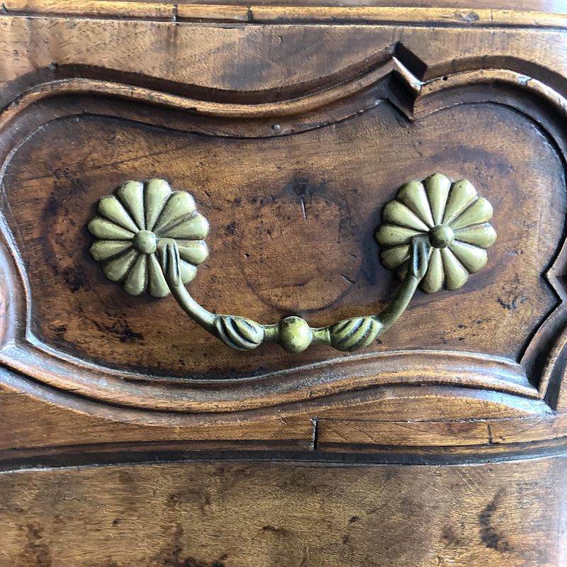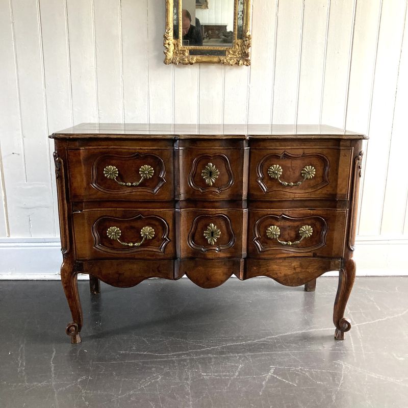 Early 20th Century French walnut serpentine two drawer commode,with brass handles and escutcheons on cabriole legs. Circa 1920