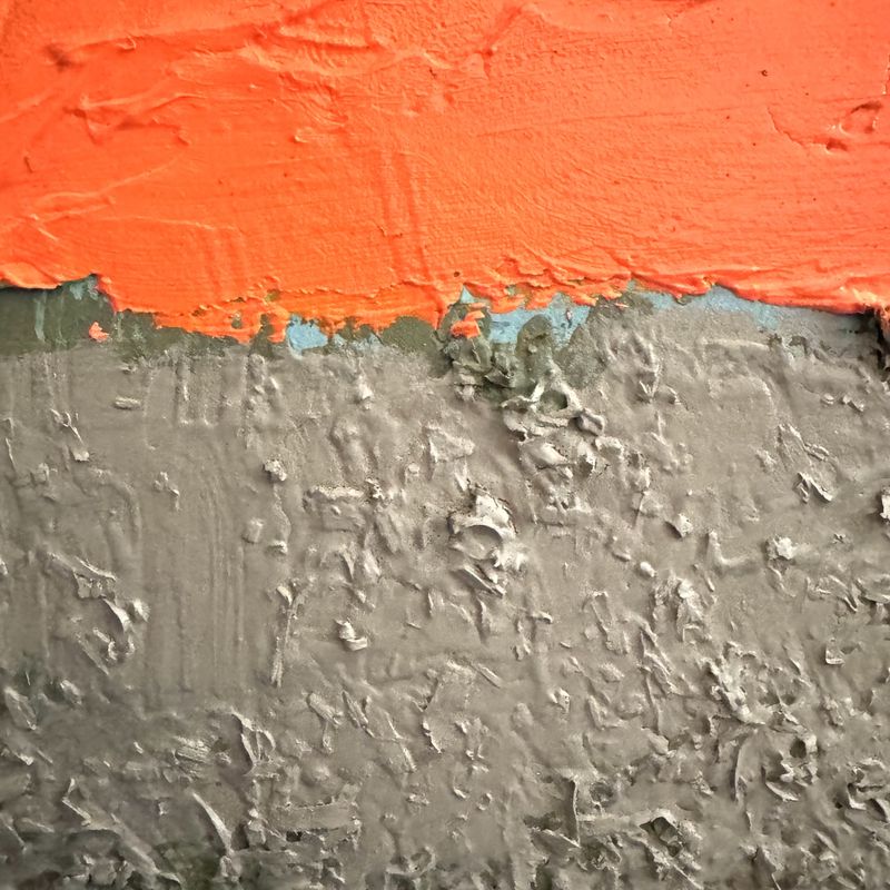 Large contemporary abstract still life, bowl and fruit thick textured paint on a fiery orange background in a wide frame