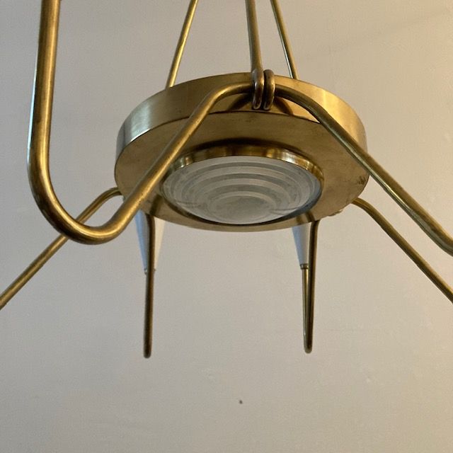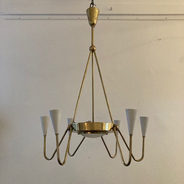 A six arm brass chandelier with an opaque glass centre. 1950's. France