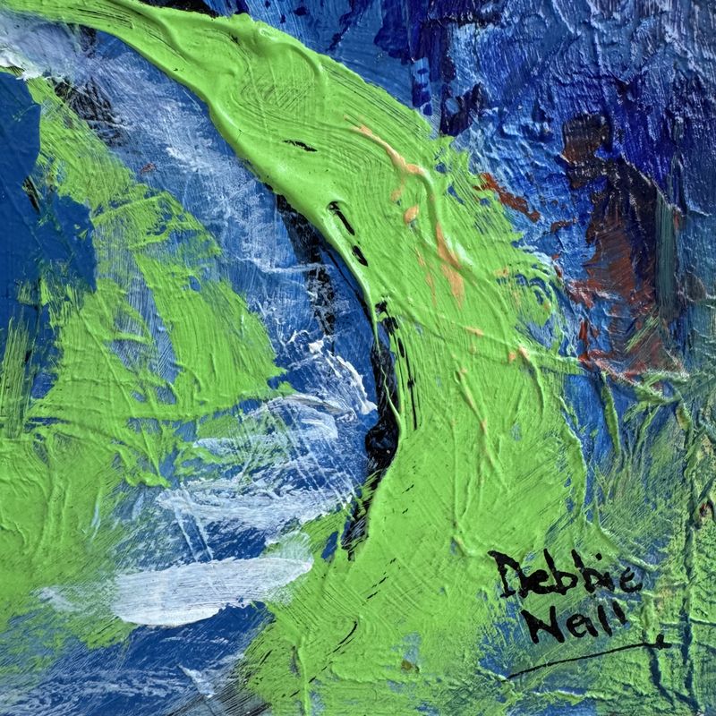 A charming contemporary colourful landscape painting, thick acrylics on board in a limed oak frame.
