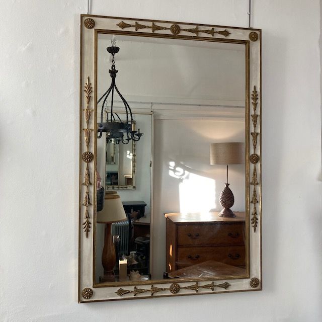 A large French Empire style mirror, white frame with gilded rosettes and decoration. France. 1950's