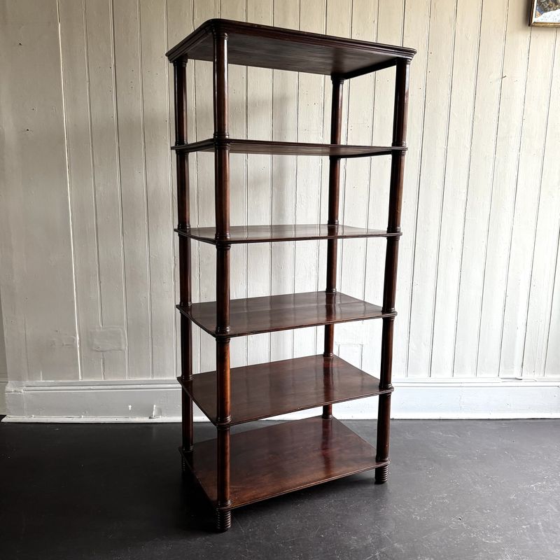 A tall six tier mahogany Etagere on bobbin feet with rich colour. 19th century English