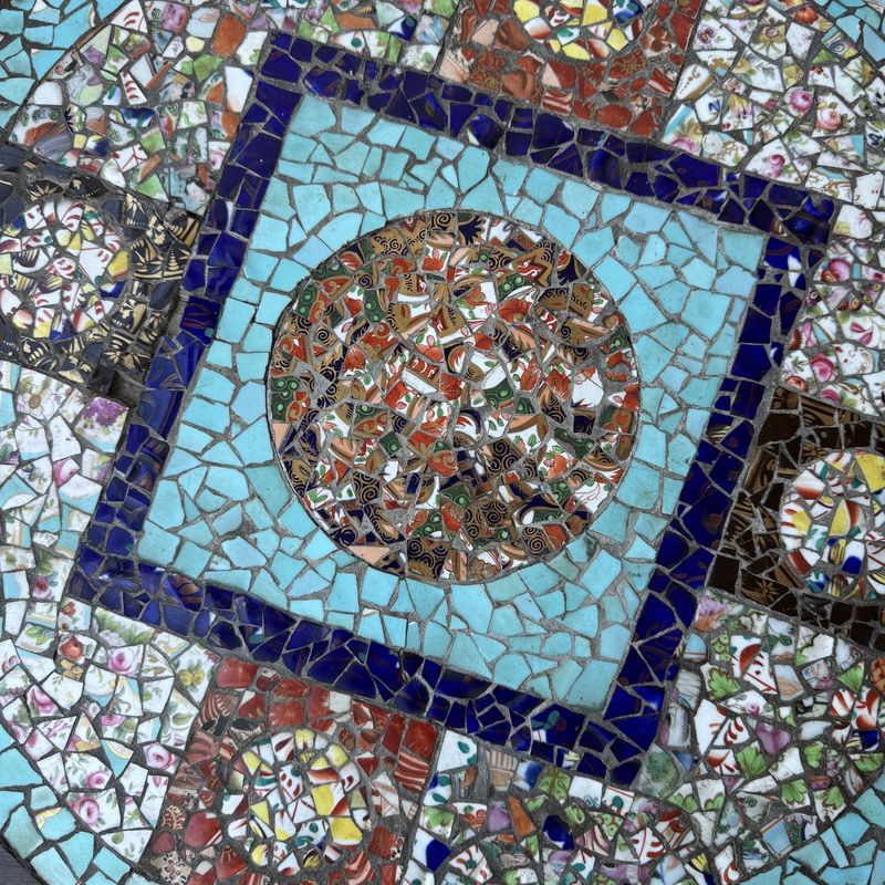 A colourful tiled mosaic tripod bobbin leg table. 19th century. English