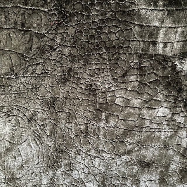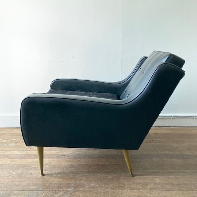 A pair of deep seated mid century armchairs, covered in leatherette with buttoned backs, new snake skin velvet cushions. 1960s. English.