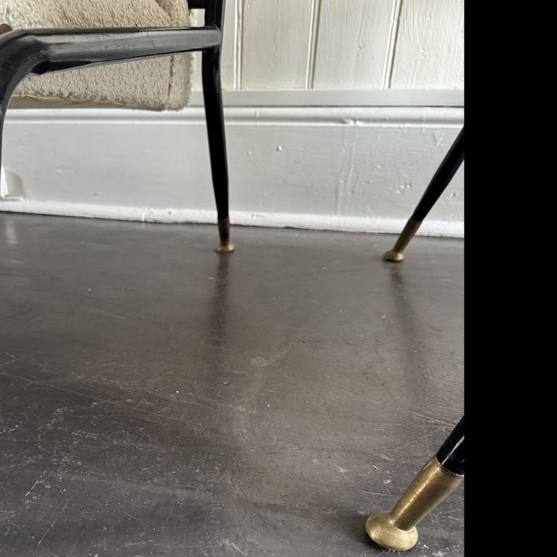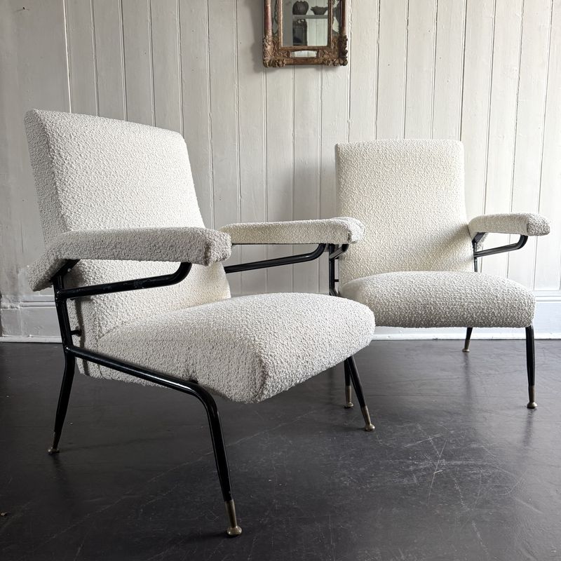 A pair of 1960s Italian metal framed armchairs upholstered in white bouclé, with round brass feet.