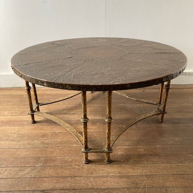 A large round copper and gilt metal coffee table, hammered gilt metal base with a sectional round copper top. 1960s Spain.