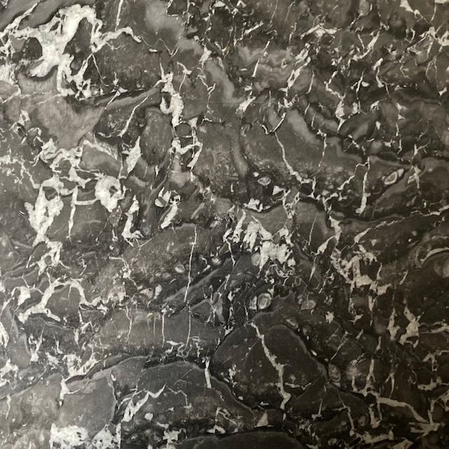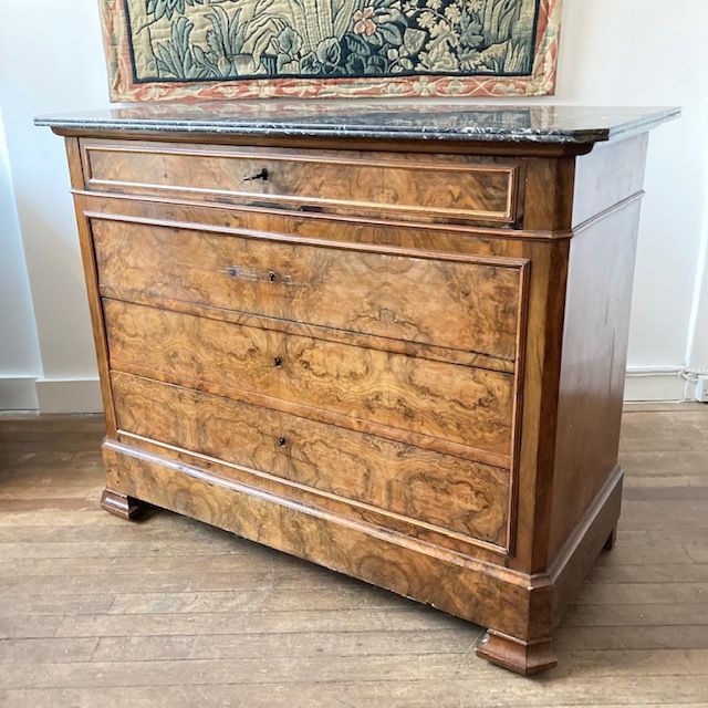 A Louis Phillippe marble top walnut commode, with book matched veneer on the front drawers, original key and a St Ann grey marble top. France. C.1830