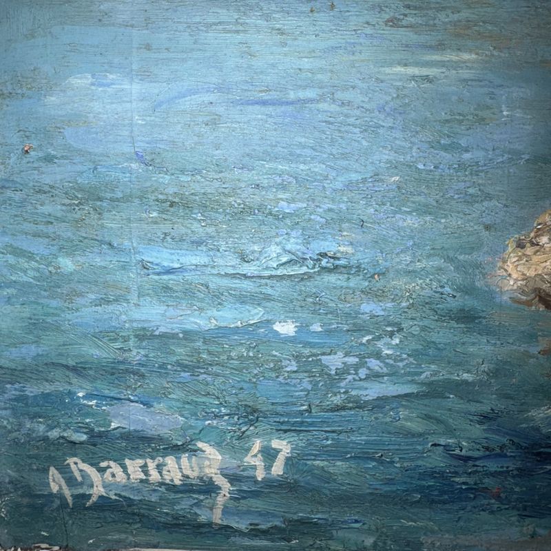 A charming painting sail boat close to a rocky shore. Possibly southern France. In a distressed textured frame. C 1947