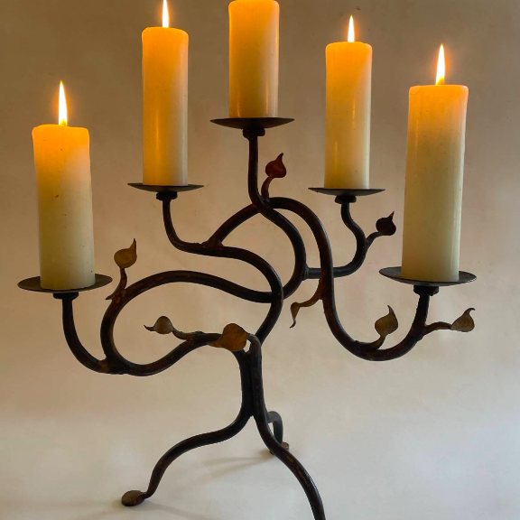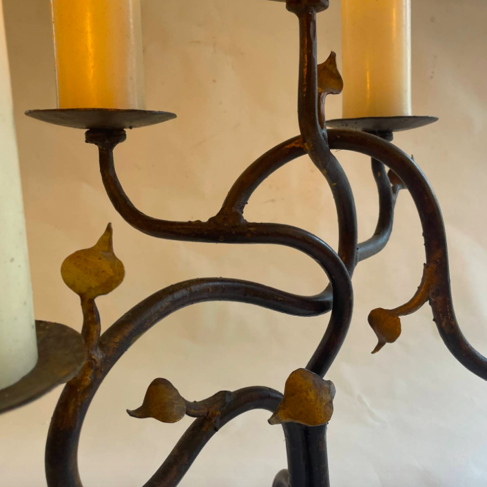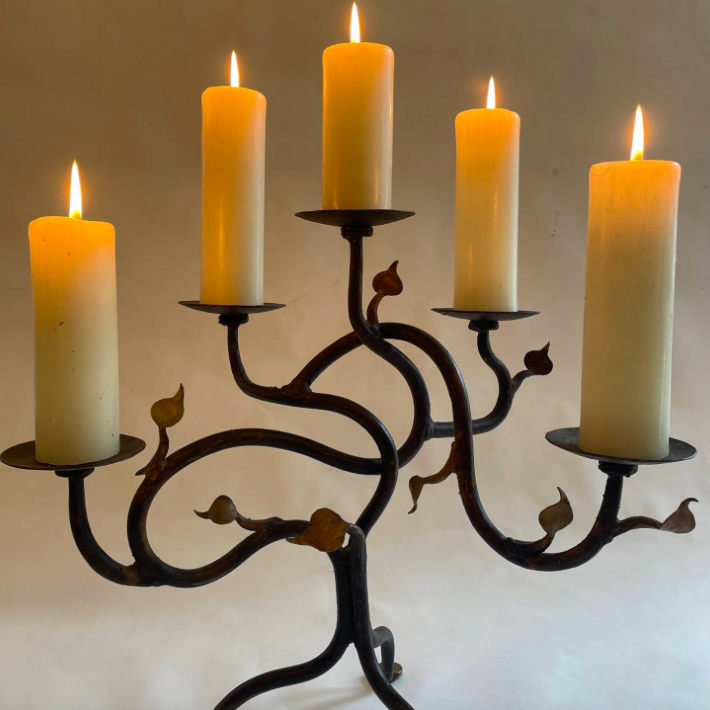 A French 5 armed mid century Brutalist candelabra. It has folded welded rods with gilded leaves upon a tripod base.