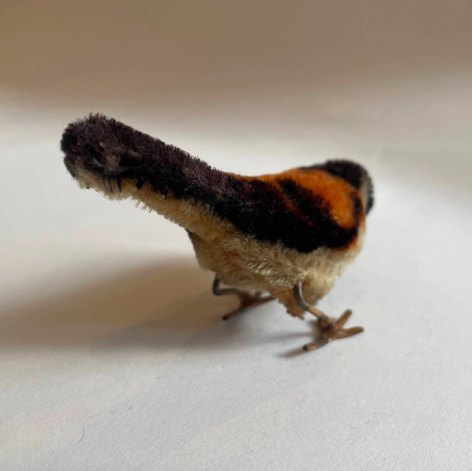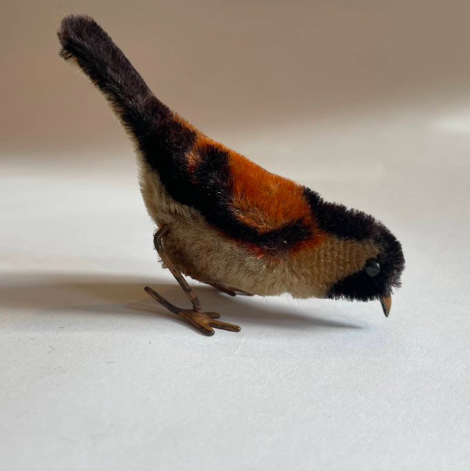 A charming German Schuco wind up mohair pecking finch. Once upon a time he was anamatronic but the key is no longer. He does still rock back and forth as if eating his seeds. A delightful little "feathered" fellow. c.1920