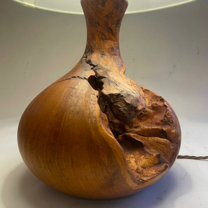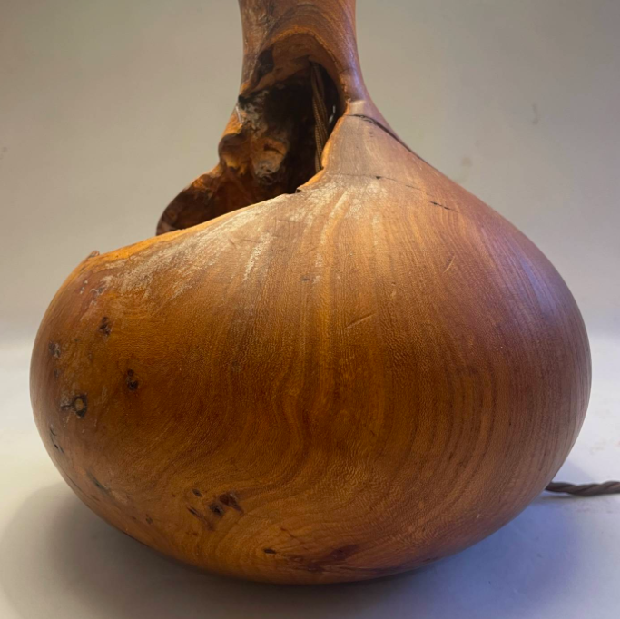 A mid century organic wood knot lamp. Hand turned burled walnut with a living edge seam, giving a very tactile and sculptural appeal. Shade not included.