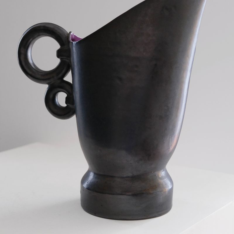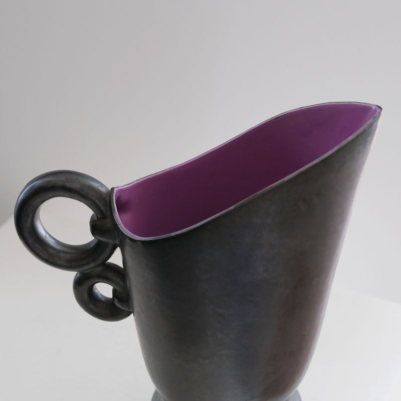 Elegant black ceramic vase with purple interior.