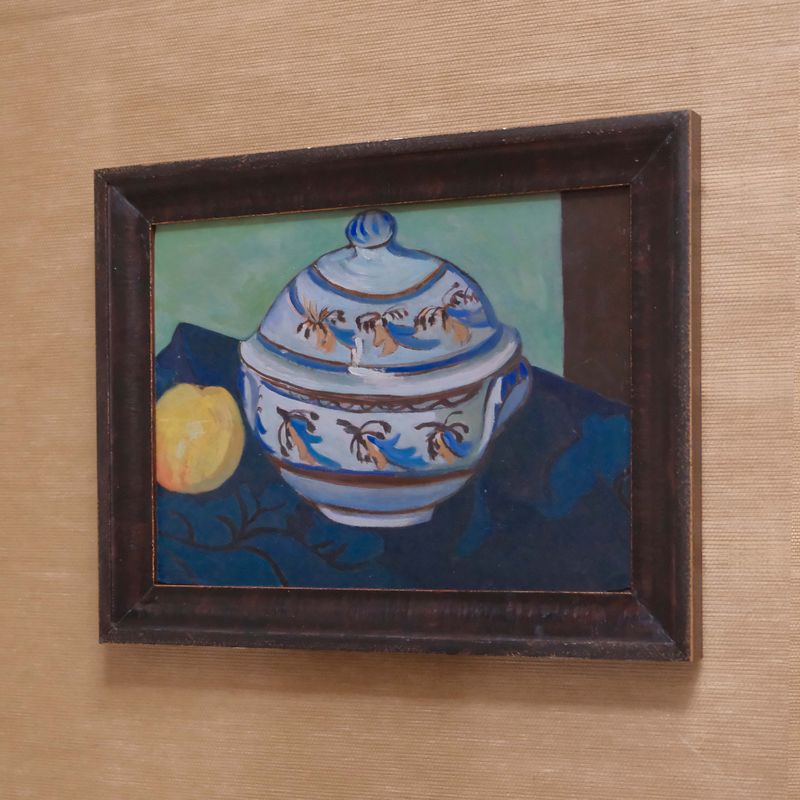 Still life from Brittany representing a decorated earthenware tureen and an apple.