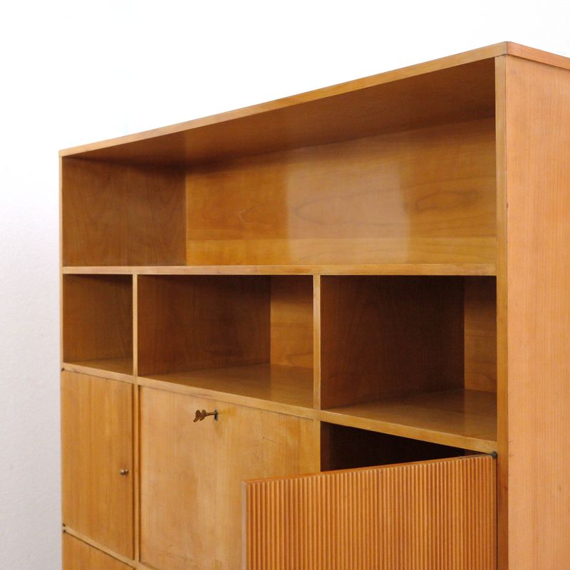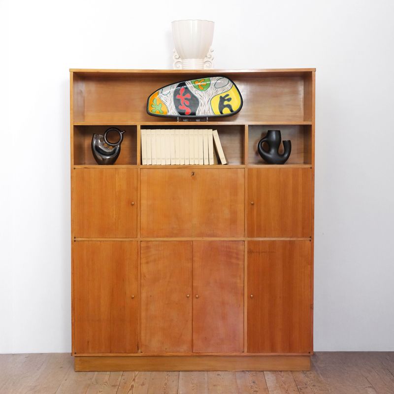 Large cherrywood cabinet with shelving and storage, including fall-front compartment.