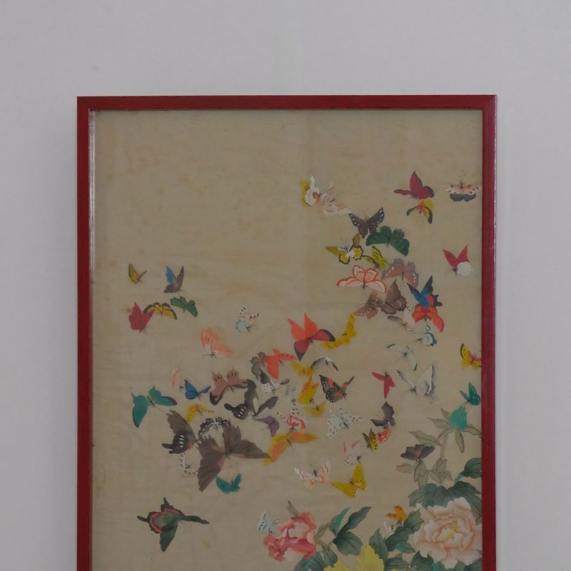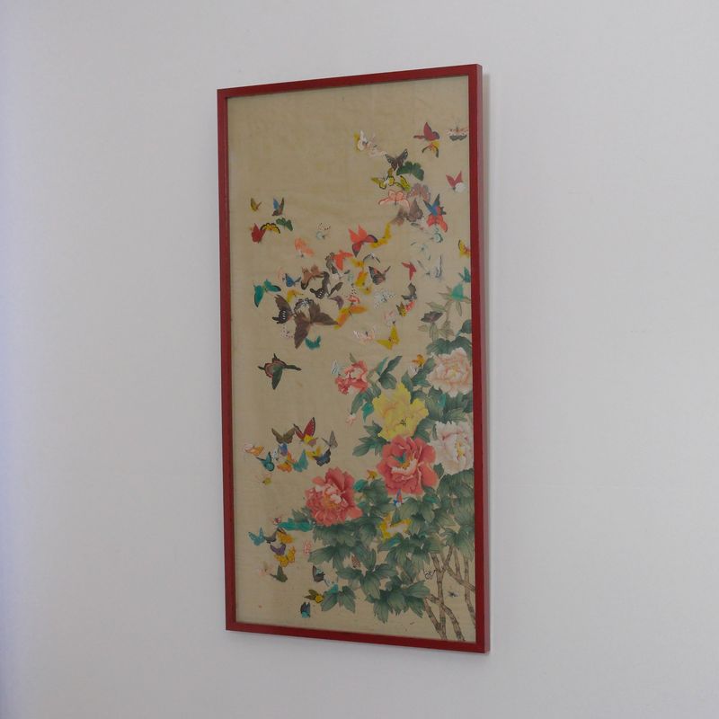 Intricate painting on silk representing peonies, foliage and fluttering butterfly.